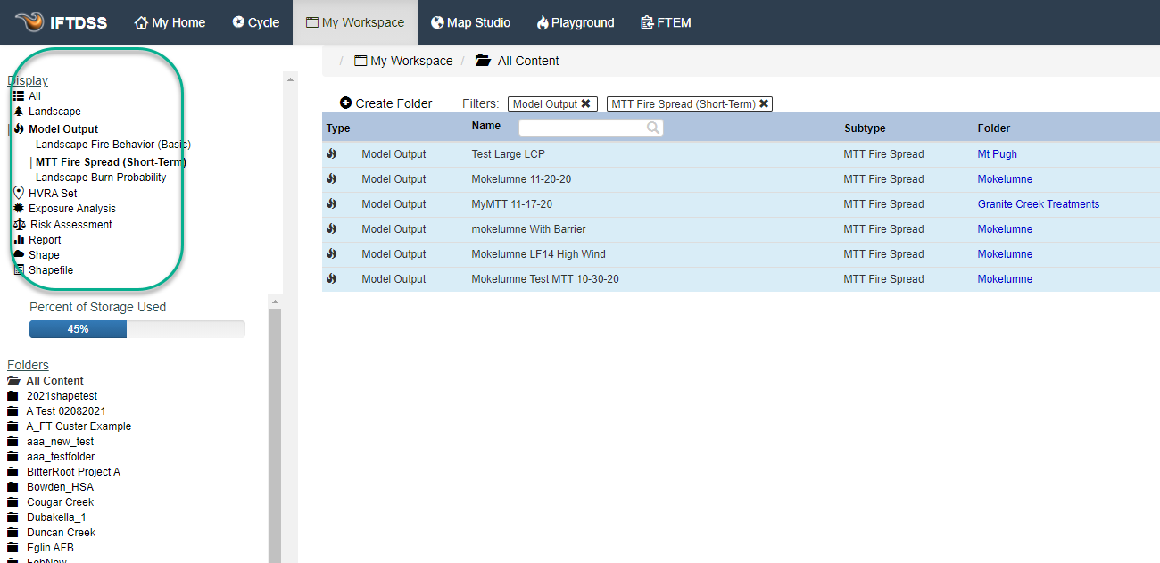 We're happy to report that in the time since this original posting, additional filtering mechanisms have been added to the MyWorkspace in IFTDSS. Specifically, the top left area now has several choices to filter landscapes, various model outputs, and other files.